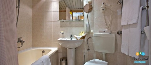 - ванна, умывальник, туалет, фен, набор полотенец, халат, тапочки, косметический набор.