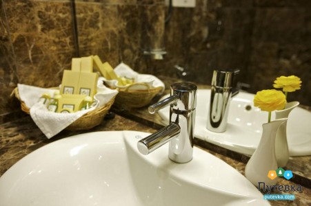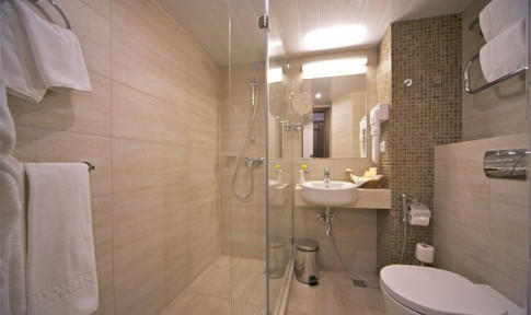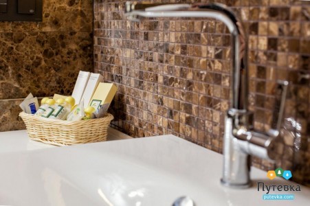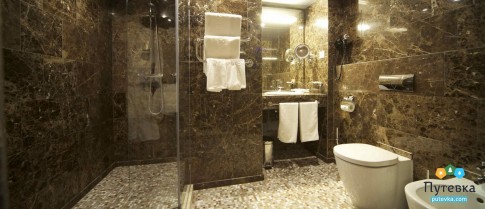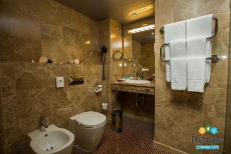 - душевая кабина, умывальник, туалет, фен, набор полотенец, халат, тапочки, косметический набор.