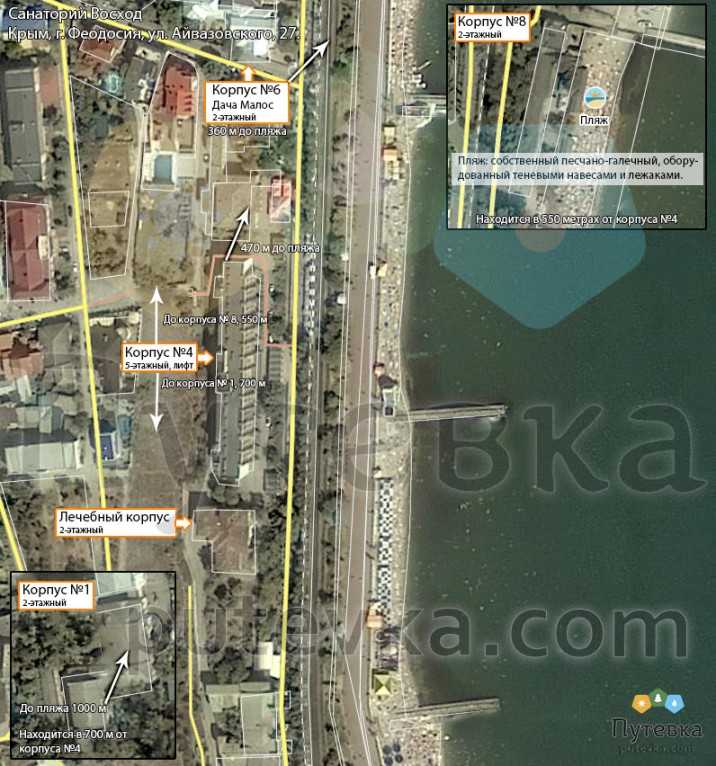 Санаторий «Восход» расположен в центре города Феодосия всего в пятидесяти метрах от моря. Комплекс раскинулся вдоль излучины Феодосийской бухты. Чистый морской воздух и песчаные пляжи создали хорошие условия для отдыха и оздоровления. В комплекс входит четыре спальных корпуса.
