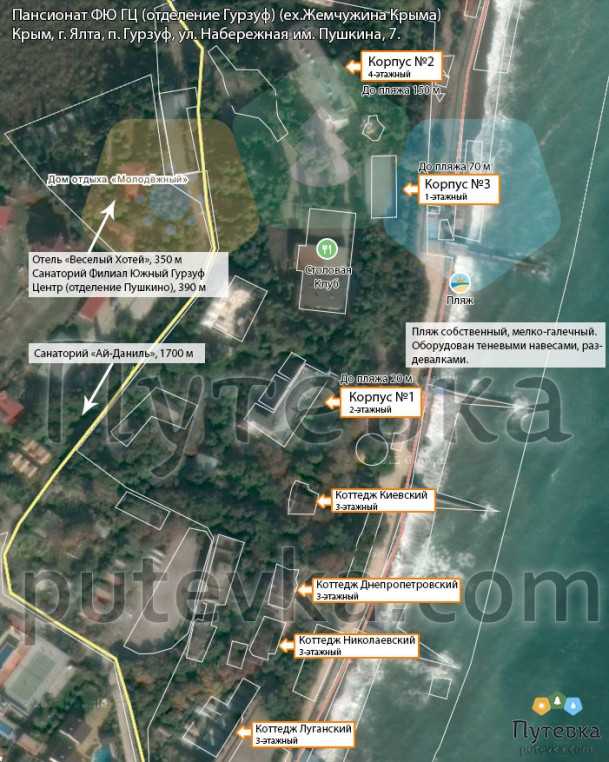 Пансионат расположен в Гурзуфе, по адресу Крым, г. Ялта, п. Гурзуф, ул. Набережная им. Пушкина, 7.